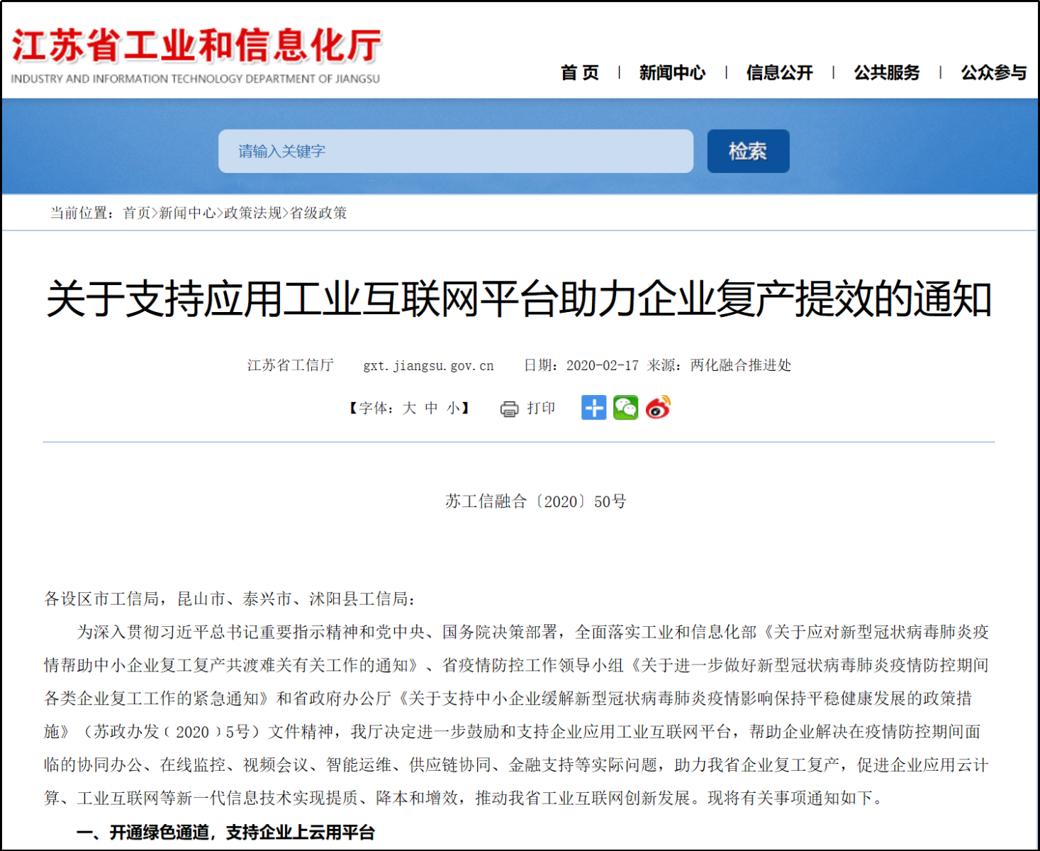 2月17日,省工信厅为进一步鼓励和支持企业应用工业互联网平台,帮助企业解决在疫情防控期间面临的信息协同等实际问题,助力我省企业复工复产,出台《关于支持应用工业互联网平台助力企业复产提效的通知》苏工信融合〔2020〕50号文。