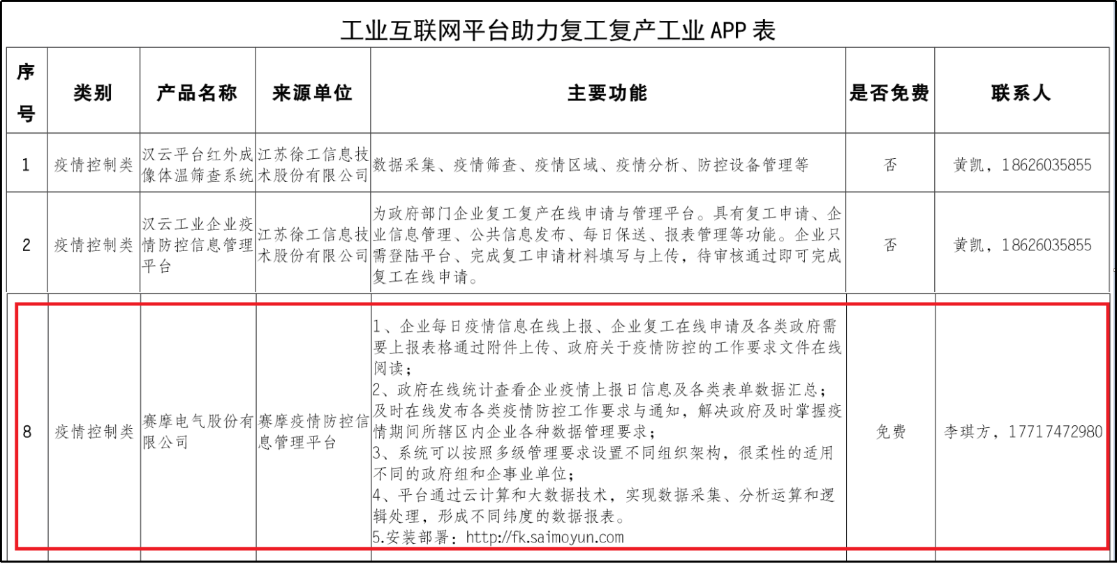 赛摩电气公司开发的“赛摩云疫情防控信息管理平台”作为疫情防控类政企信息互通平台列在复工复产工业APP名录中,并向全省各级政府和复工复产集团企业发出信息数据上报网络绿色通道的邀约。