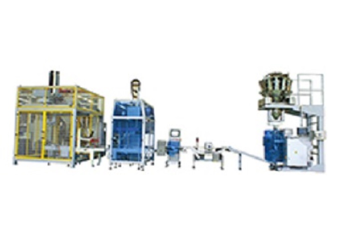 FFS全自动重膜包装机,结构紧凑、运行效率高,适合包装粉、粒料。薄膜卷由放膜卷机构的输送胶辊引入包装机,经角封机构、底封机构后,制出空包装袋,包装袋依次经开袋口、充填、上封口、充填、上封口、口封冷却后,完成包装作业、送至码垛机。